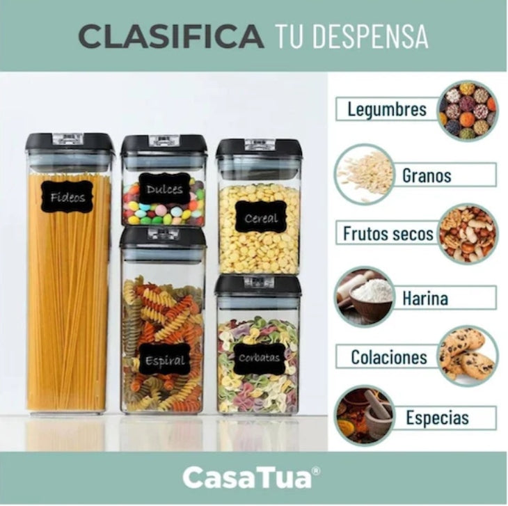 Cierre 100% hermético para asegurar la frescura de tus alimentos Mecanismo de cierre Airlock, fácil de abrir y cerrar Cuerpo transparente para que puedas ver todos tus alimentos Ficha Técnica Material: ABS, resistente y duradero Libres de BPA, seguros para el almacenaje de alimentos Color: Tapa negra y cuerpo transparente Medidas contenedor XL: 31 x 10 x 10 cm Medidas contenedor L: 21 x 10 x 10 cm Medidas contenedor M: 15 x 10 x 10 cm Medidas contenedor S: 11 x 10 x 10 cm Peso total: 1,4 kg